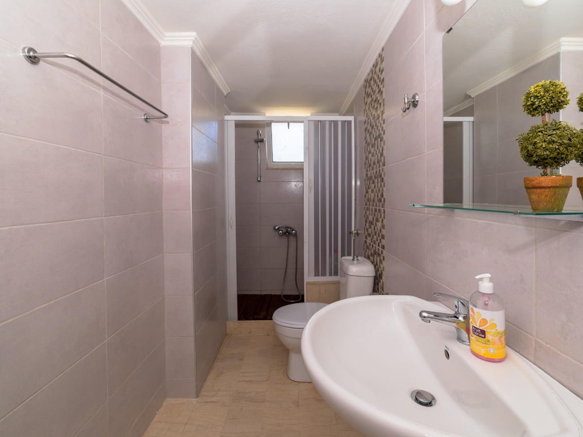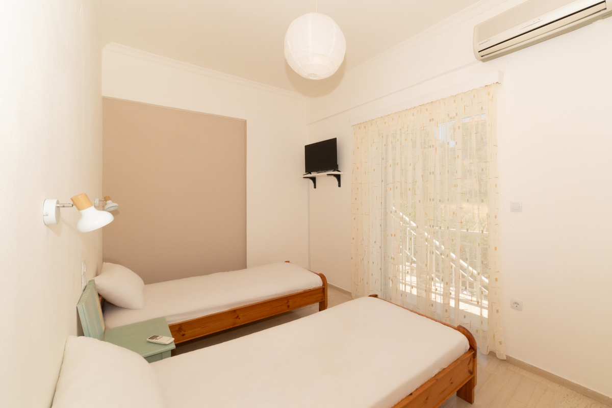 This apartment / house is located on the elevated (10 steps) ground floor of the building, it has a view to the front as well as to the back garden, it is airy and consists of: 2 bedrooms (1 with a double bed and 1 with 2 single beds), kitchen-living room , bathroom and balcony-veranda. It has 2 TVs, one in each bedroom and in particular the TV in the room with the double bed is 39” smart with YouTube and active Netflix. Also in the single living room-kitchen space, there is a sofa bed.